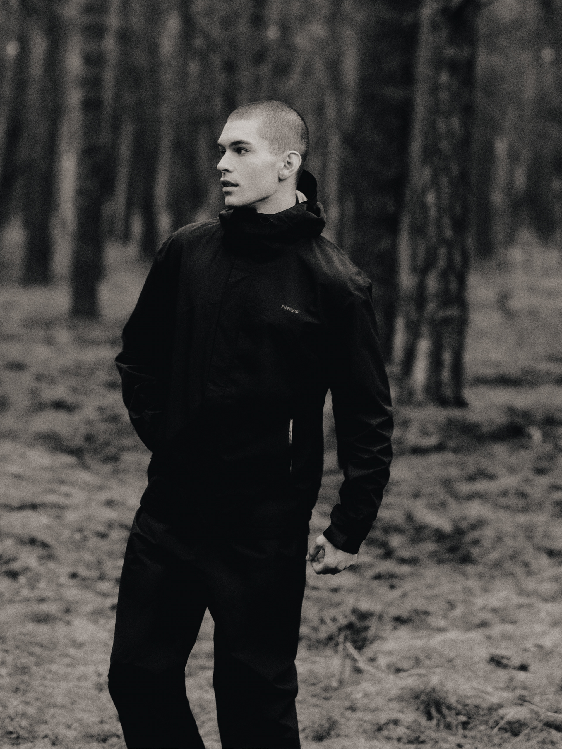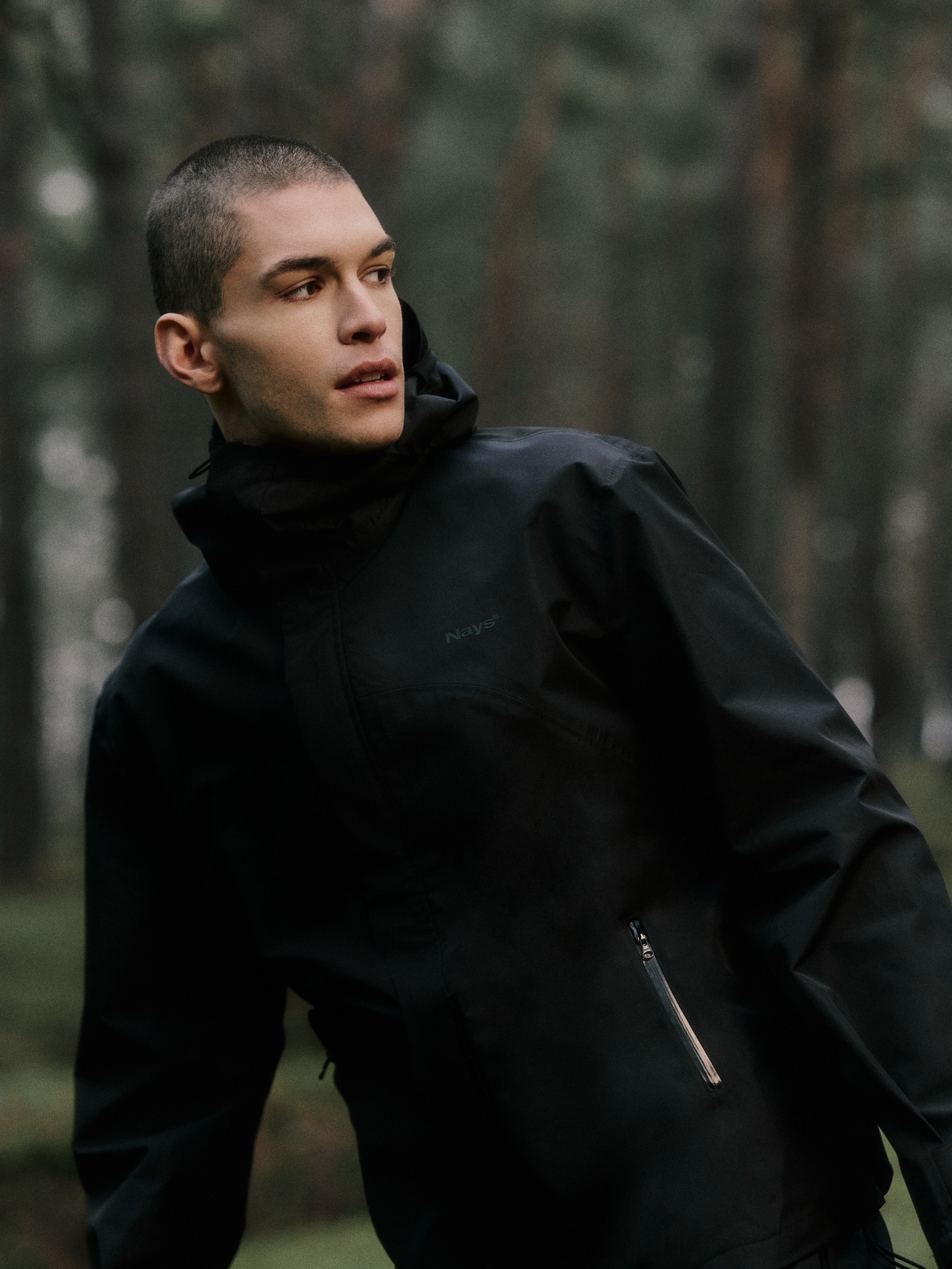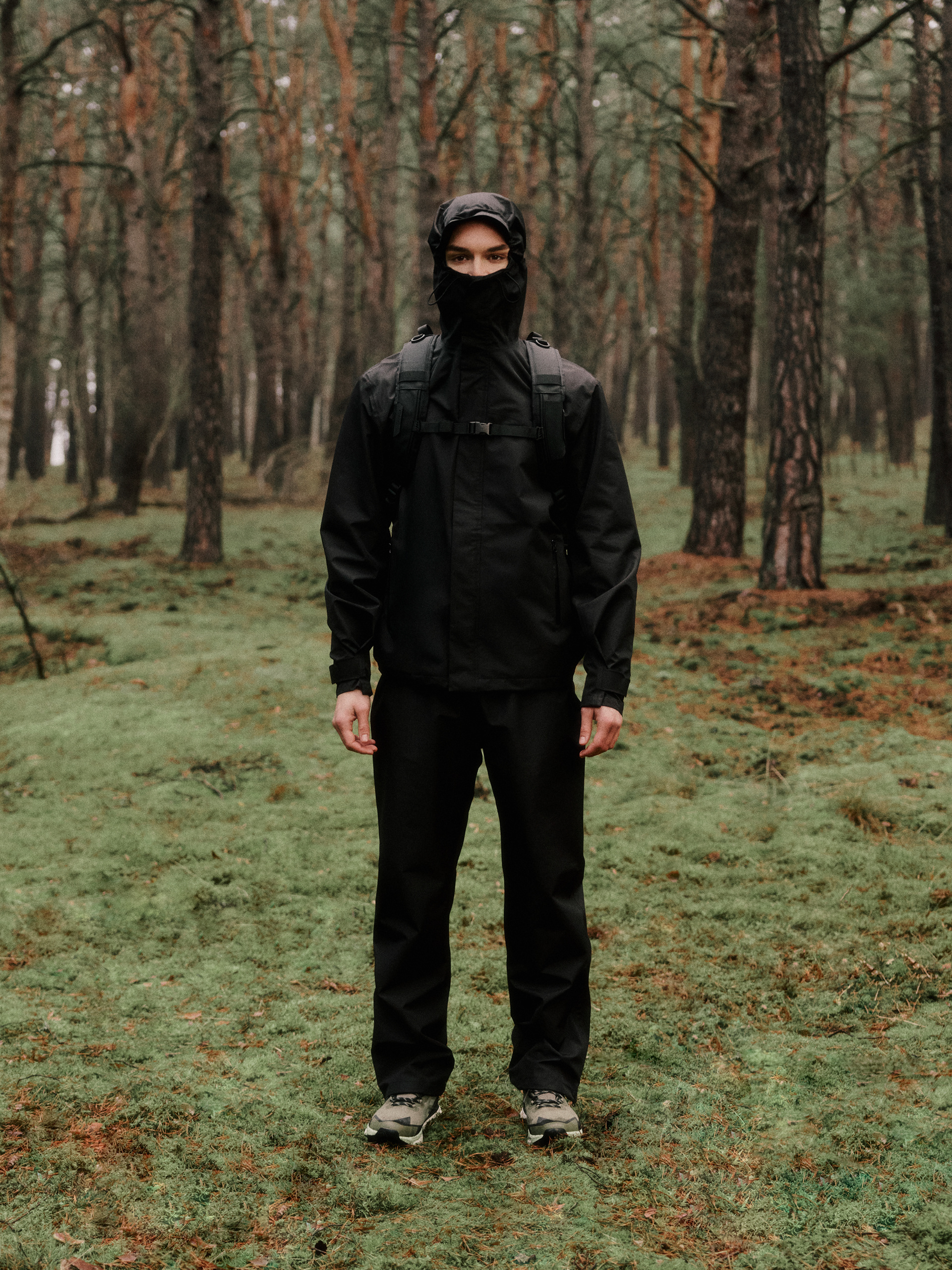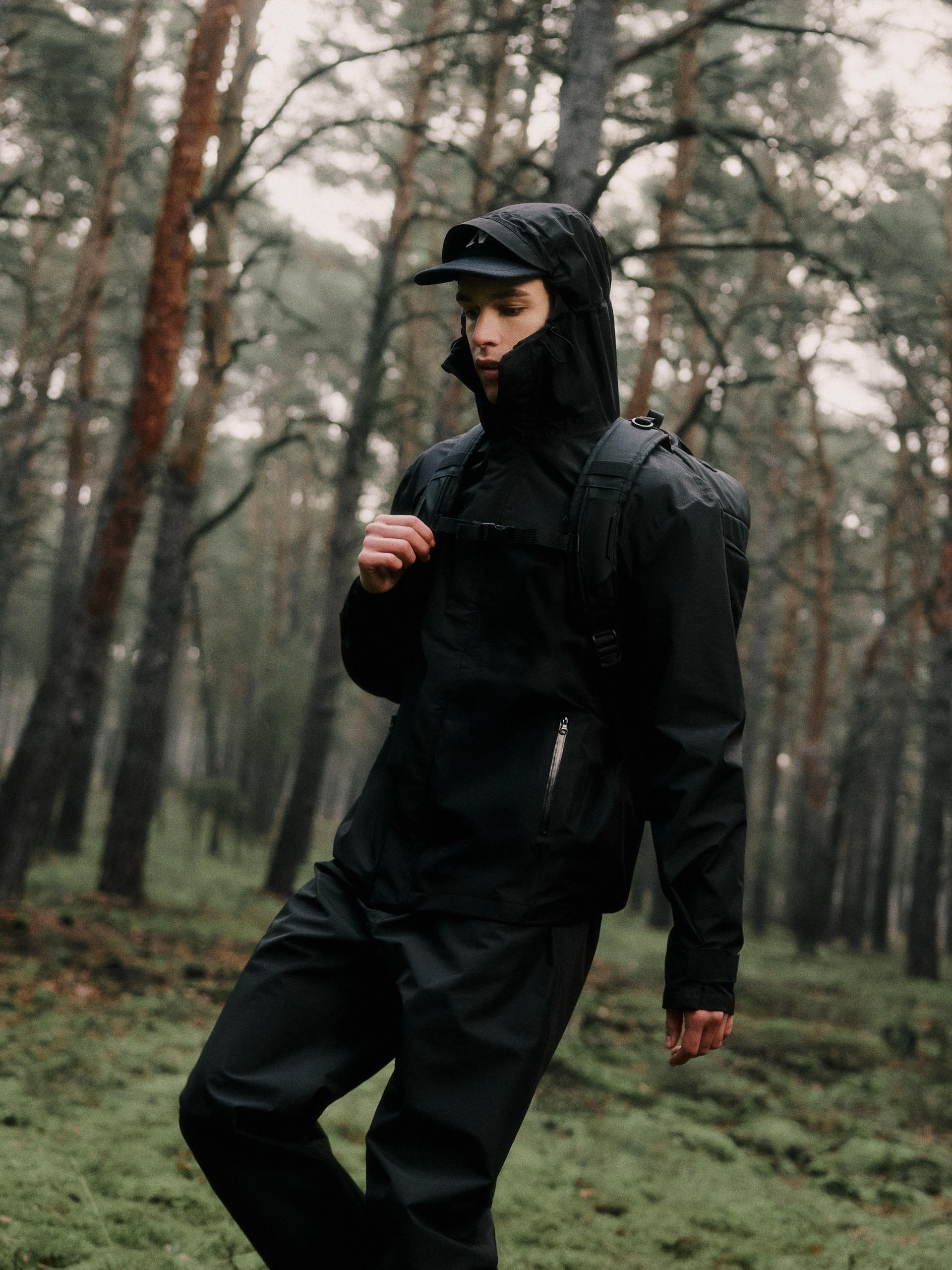Technical outdoorwear design with 3-layer materials, PFAS-free coatings and a focus on breathability, waterproofing and function.