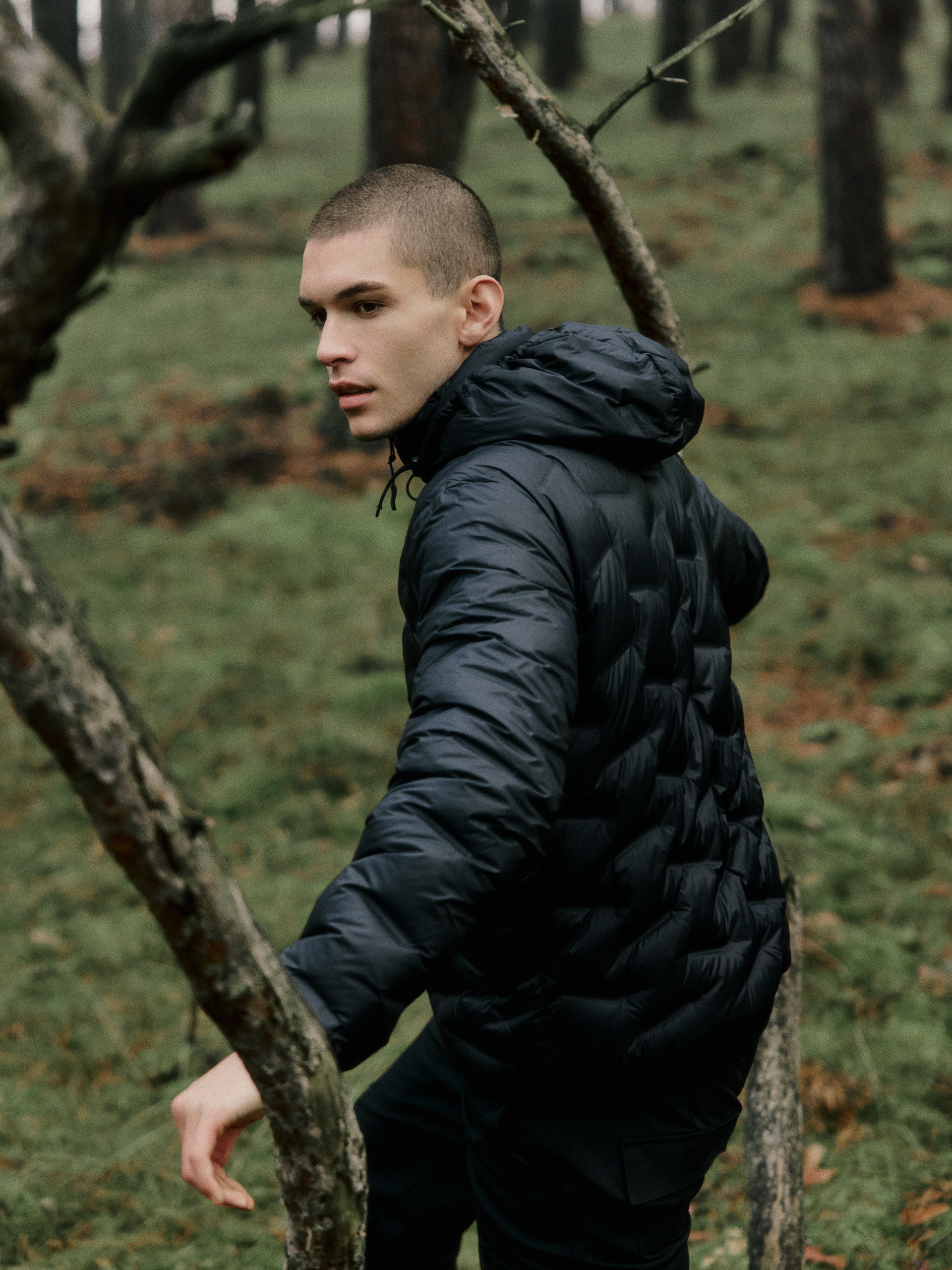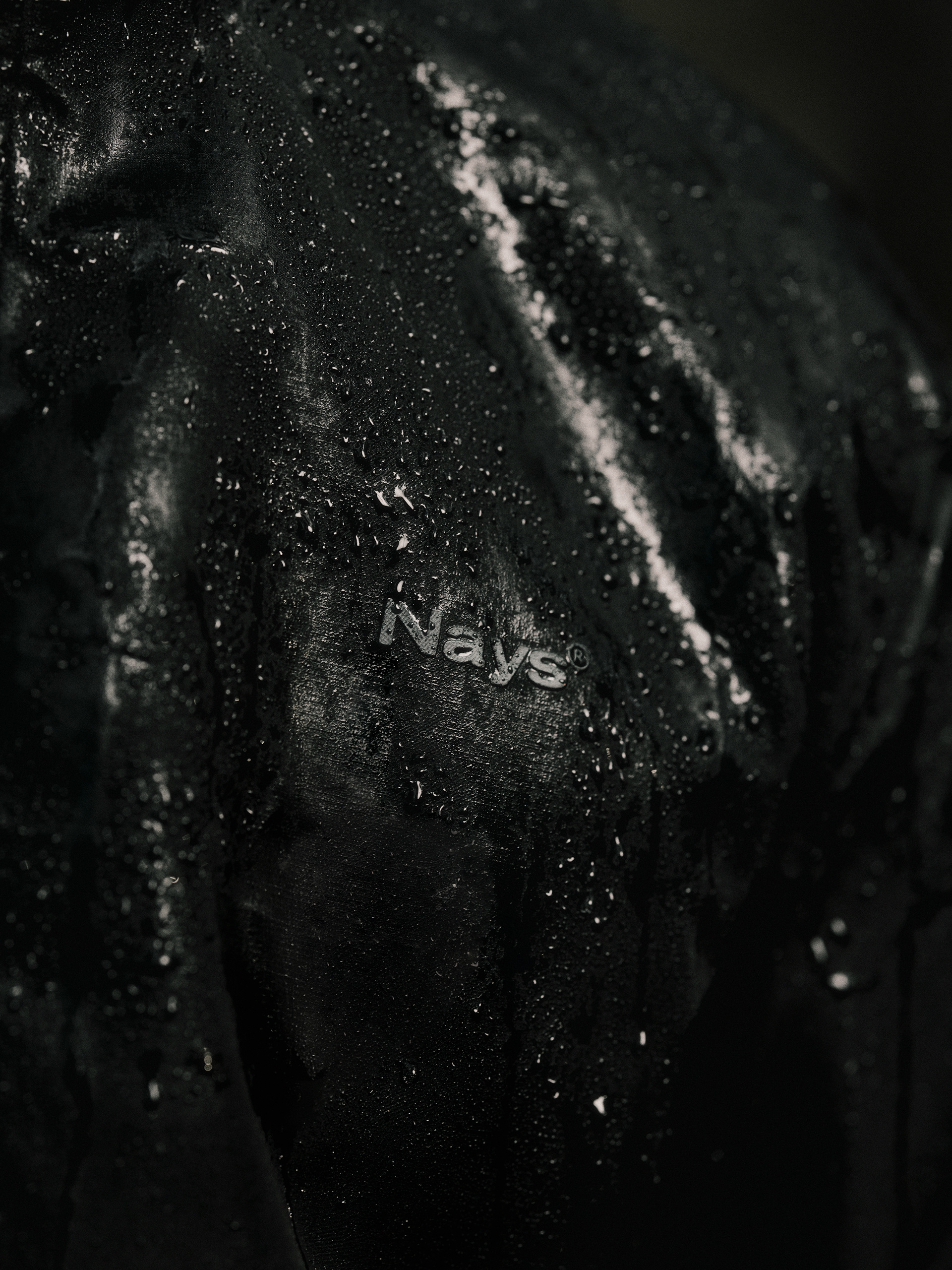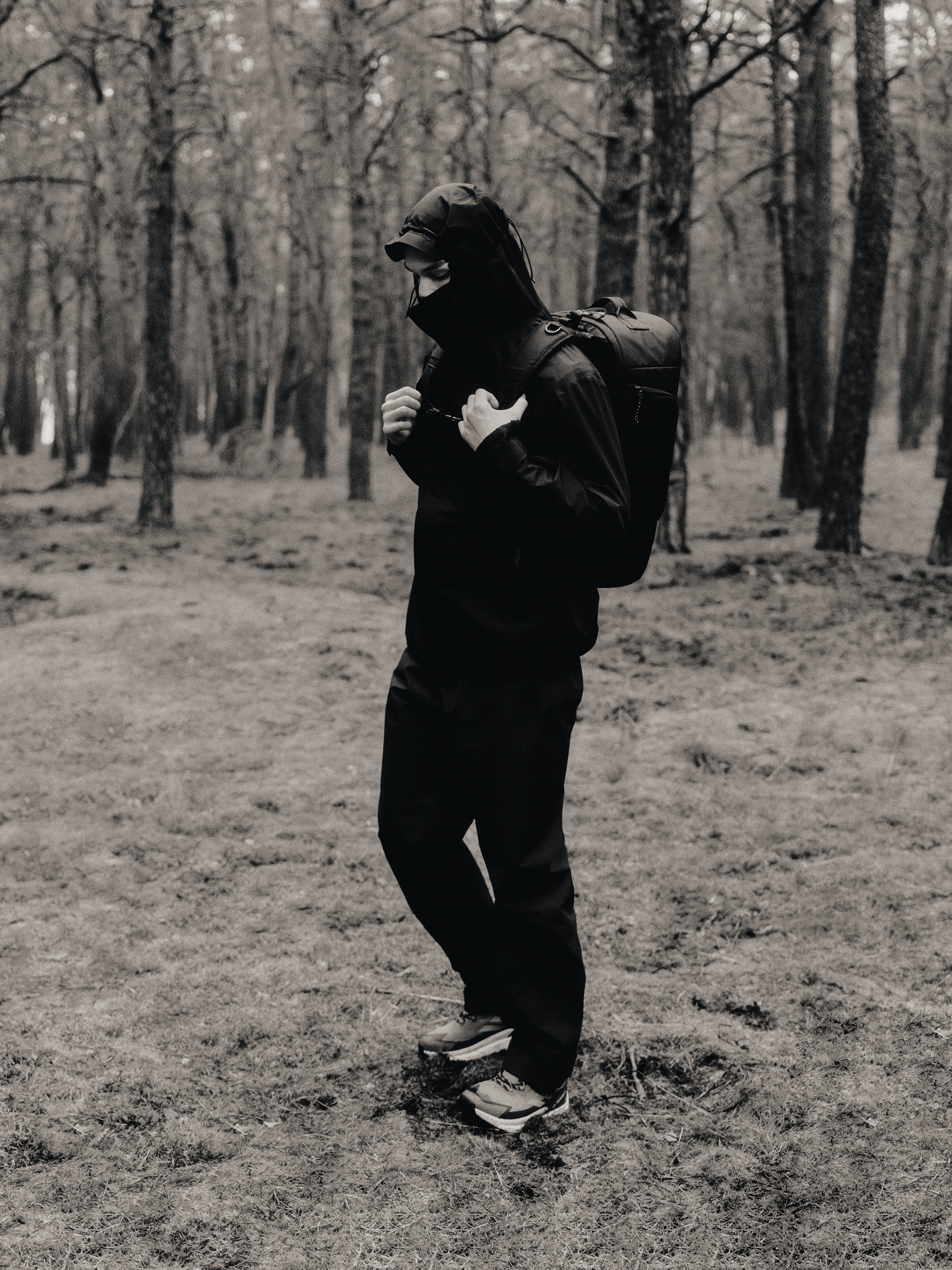 Technical outdoorwear design with 3-layer materials, PFAS-free coatings and a focus on breathability, waterproofing and function.